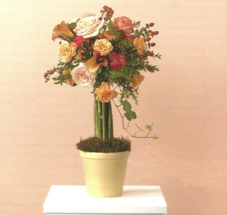 Once delivered, assemble the topiary to the pot, carefully pressing the dowel rod deep into the pot foam.