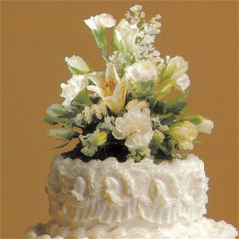 This lovely old fashioned cake is topped with a simple mixture of flowers in white.