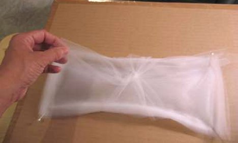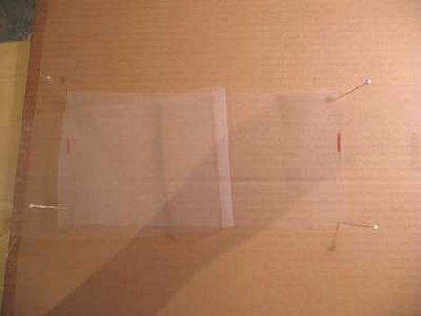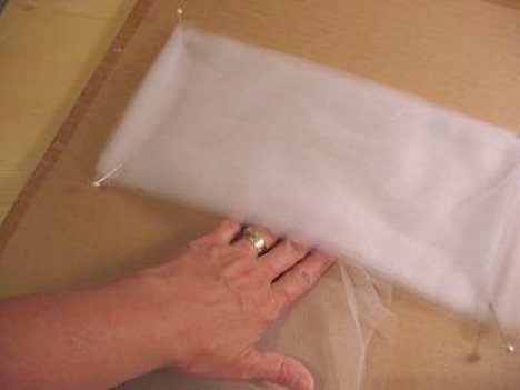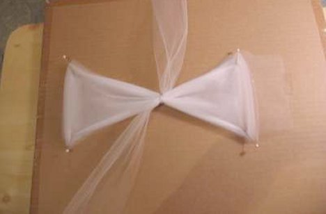 Tulle can be very slippery to work with. You need to fold your tulle back and forth like an accordian pleat. Pin the cut end on the first mark with two corsage pins. Fold tulle back to second mark. Pin with two pins.