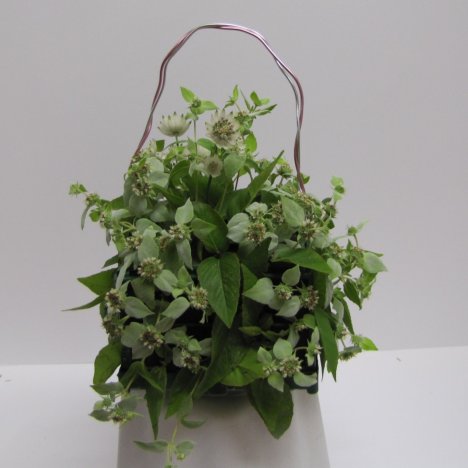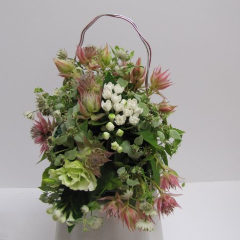 White astrantia comes in white and lavender/pink colors. It adds a whimsical wild flower look to this overall design.