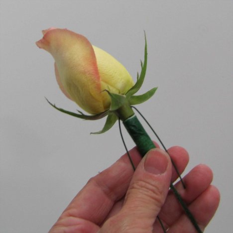 Wiring a boutonniere gives it additional strength and less likely hood of the head snapping off from the stem. I pierce the short stem left on the rose directly under the head of the flower.