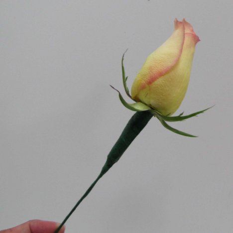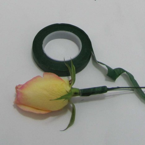 Pull the tape around the stem so that it sticks to itself. Wrap in a downward spiral, covering all of the rose pick down to the bottom for a smooth finished look.