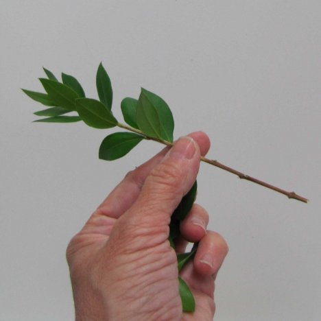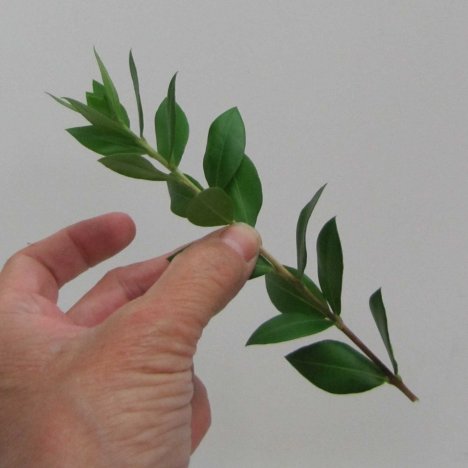 I begin by using a fresh lateral cut from a myrtle stem. Myrtle has a clean fresh scent when freshly cut and adds a nice touch to both boutonnieres and corsages.