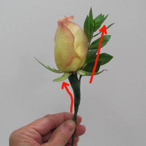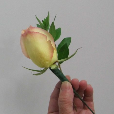 Place the greenery behind the rose head, edging slightly above the top of the flower.