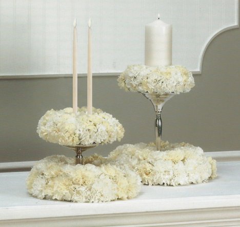 These unity candle carnation rings are simplistic and perfect. They can be recreated in different colors, such as red, yellow, pure white, purple/lavender, orange/peaches and green since carnations do come in all those colors!