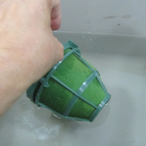 The third florist foam product is known as an Iglu cage. The plastic cage tends to float, so turn it upside down and allow it to absorb as much water as possible. It doesn't take long to become fully saturated.