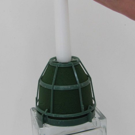 Simply push the candle down into the opening from the top of the Iglu. Some water may be forced out of the foam, so be sure you are on a designing surface when you do this. It's easier to put the candle in before designing, otherwise flower stems may crowd the inner portion of the foam keeping the candle from being inserted.