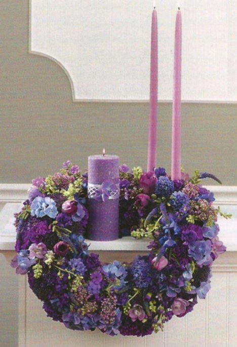 As you add flowers,. start with the portion sitting on the table top first. This will add weight to the arrangement and keep it balanced when you add the flowers to the bottom portion. Insert all flowers into wreath. Wind decorative ribbon around pillar candle. Shorten a corsage pin. Heat the pin shank and insert into candle, pinning the lace in place.