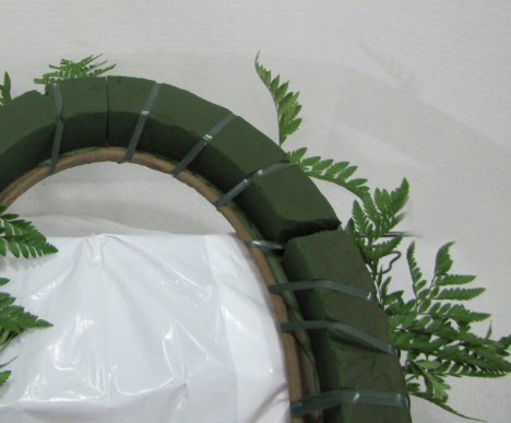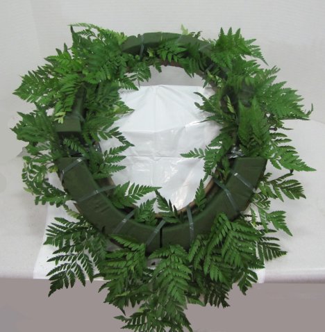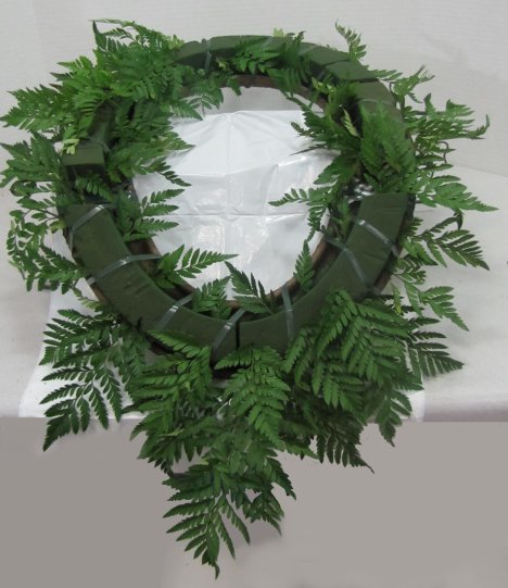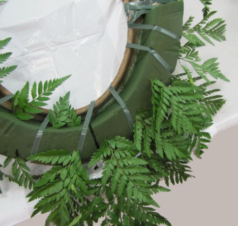 Don't forget to insert greenery in the inner parimeter of your wreath. Any surface that has open green foam should be filled in with greenery. Covering the foam, mache and tape is referred to as "covering the mechanics" of a floral design.