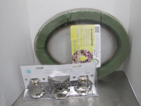 Our unity floral wreath begins with an Oasis mache foam and an inexpensive unity candle stand.