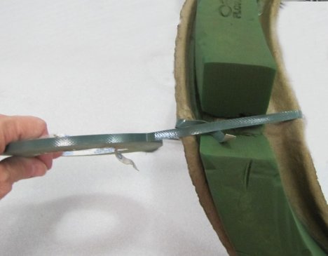 Once the wreath is broken on both sides, you'll want to reinforce the backing with waterproof florist tape. This is similar to duct tape, except cut into very thin strips to use with wet floral foam and other products.