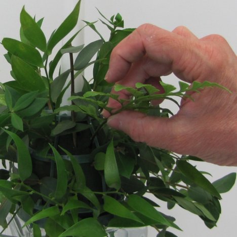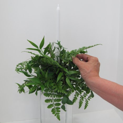 These unity wedding candles will be finished by adding the last greenery . . . leather leaf fern. This florist green is available all year round and is used in all flower shops as an economic filler for their flower designs.