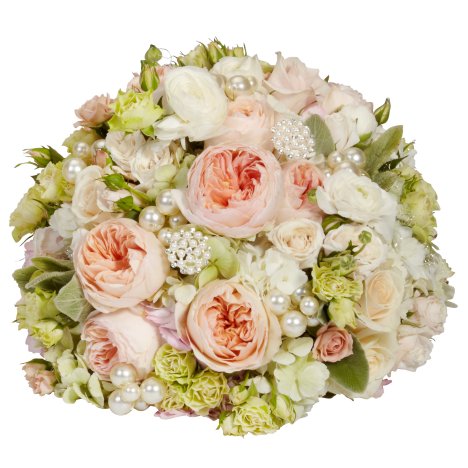 Randomly insert your largest focal flowers first, then the secondary flowers and then the small spray flowers. Add pearls, beads and other flower jewelry. If you wish a true old fashioned centerpiece, add in some wispy sprays of Baby's Breath.