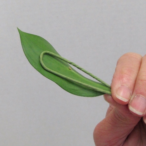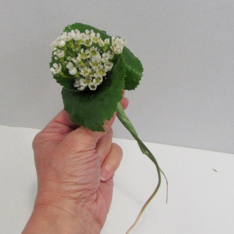 Tape into place, allowing a good portion of the pointed leaf to show for contrast against the rounded galax leaf.