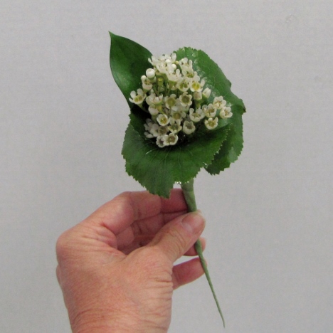 A waxflower boutonniere has a massed effect with tiny, perfect blooms. Tape the last galax leaf in place, snipping off any excess stem.
