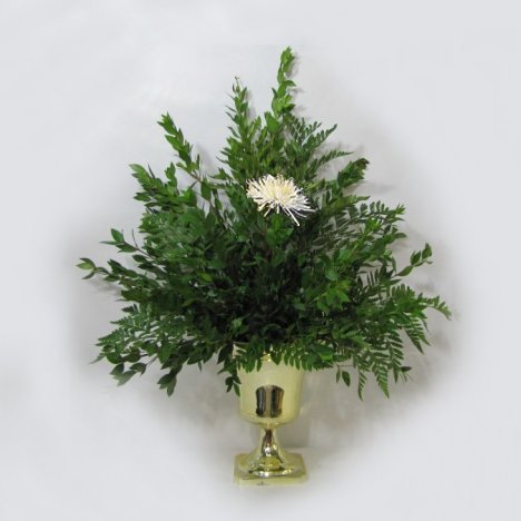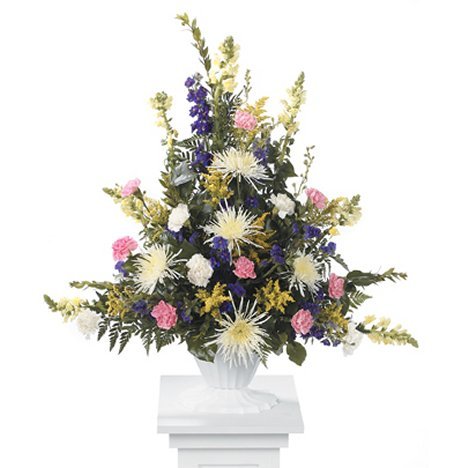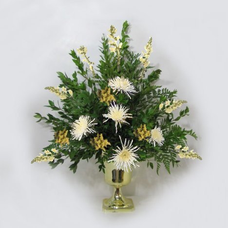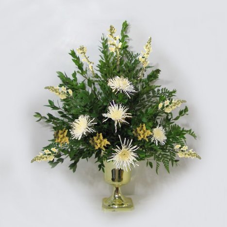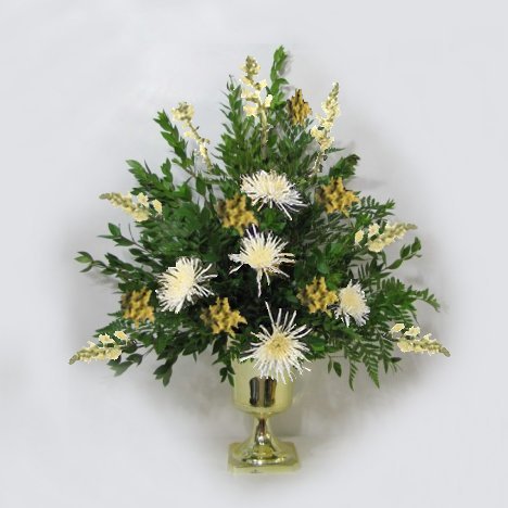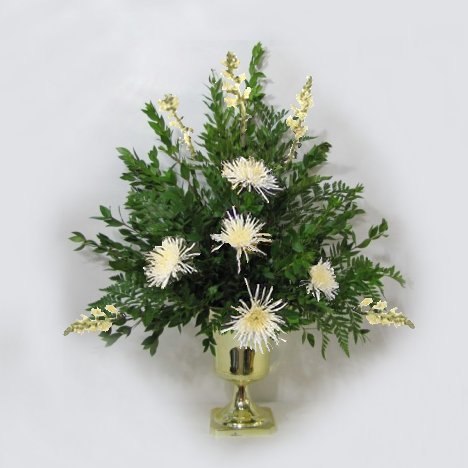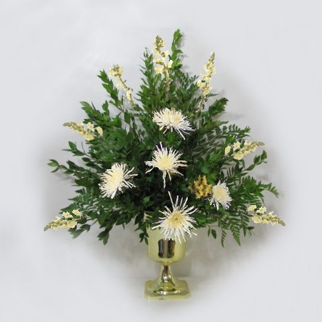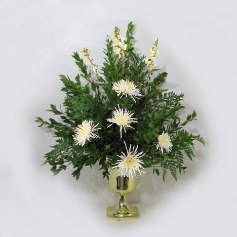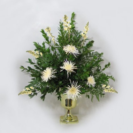 Florist do this all the time. What they have to learn is basic design greening and flowering techniques. For instance - this is a typical fan spray that can sit on the altar or risers in a church setting. If a bride brought me a photo from the internet as shown below, I would first have to break it down into a flower recipe. This simply means I have to make a list of the products and fresh flowers needed to create a similar design. So I would start like this: