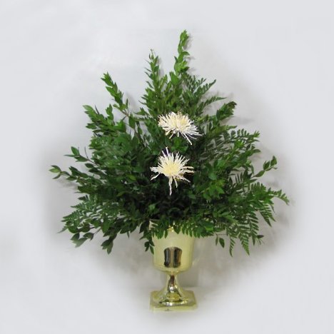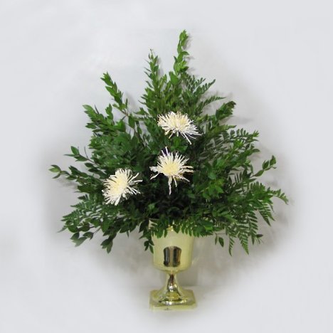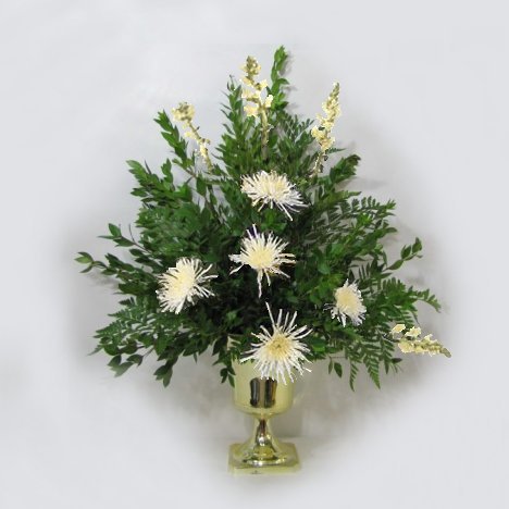 I start with the largest focal flowers. In this case, it is a large white spider mum. I generally recommend that you use cheaper flowers for decorating the sanctuary. Remember this is a large piece and has to have impact from a long distance. Save the expensive flowers for your bouquets and go with less expensive alternatives (such as chrysanthemums, daisies, roses, carnations, solidago, spray asters and other lovely flowers).