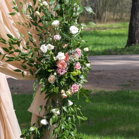This wedding arch decorations is heavy on rustling greenery, with a center clutch of flowers at the draping point. The designer took advantage of the long stems of Italian Ruscus to make this long lined flower decoration.