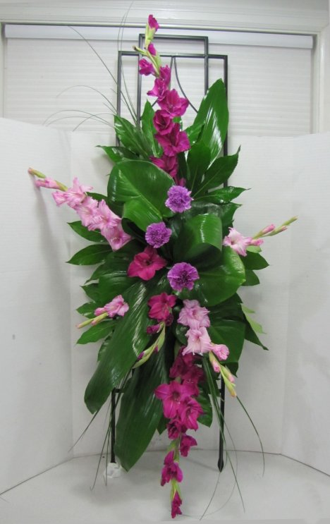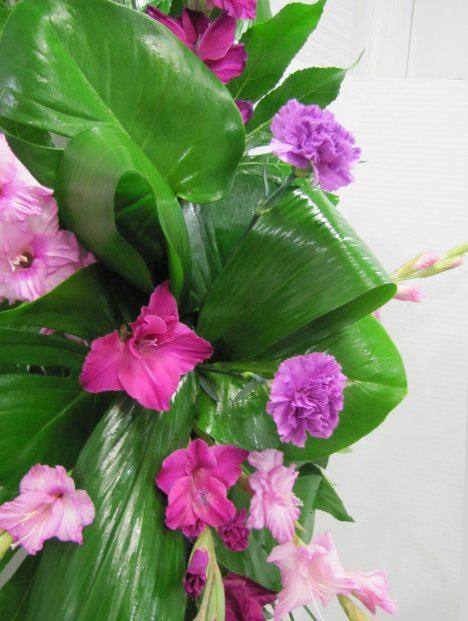 Tuck some of the flowers deeper into the design, such as this gladiolus blossom tucked right between the folded Ti leaves.