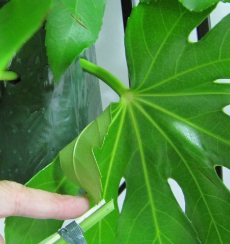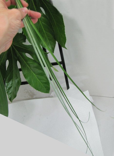 This shortening of the center gives a "spray" feel. If you want a more overall evenness to the design, don't emphasize a spray center, but insert leaves at random in from all angles.