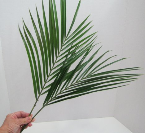Another very common greenery is leather leaf fern. Typically broad leaves with slender (but sturdy) stems that is one of the cheapest kinds of greens that hold up well in summer conditions. It is available all year round. It is less expensive per bunch than the tropicals, but it takes more fern to cover the mechanics of the foam.