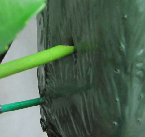 After the bar is completely saturated in water, it's contained and ready to design on. For bigger flower stems, I usually use the point of my florist knife to poke a tiny slit into the poly film.