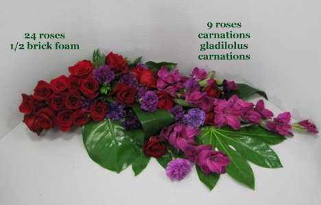 You can see by the photo below that the flowers are tightly massed on the left - while flowers and greens are mixed and have longer stems on the right. See how you can get more design power out of less flowers by keeping the stems longer and mixing in greenery.