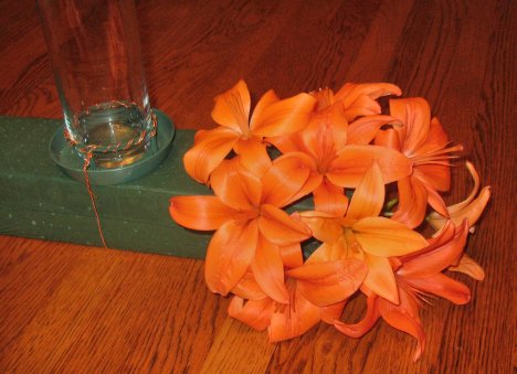 Here's an actual photo of showing just Asiatic lilies (very durable flowers) inserted into a raquette. This piece was used as a flower arrangement on the head table. You can see how versatile raquettes are. They can be used for centerpieces down long rectangle tables, long arrangments down church altars, balanced on railings of gazebos and much more.