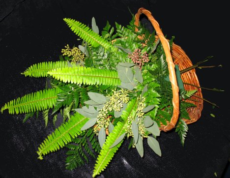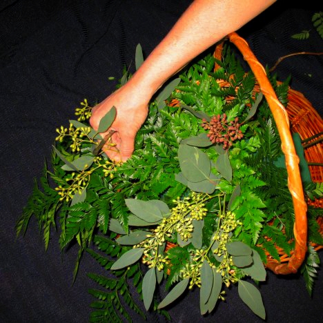 This wedding basket design is all about contrasts. I'm using seeded eucalyptus because of the interesting seeds and the lighter, sage colored leaves.