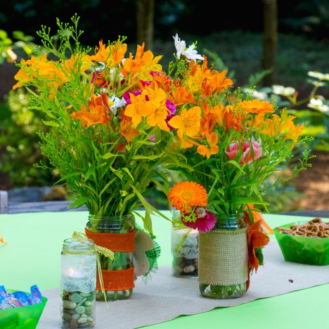 Canning Jar Centerpiece; Learn how to make all different types of centerpieces, including those that work well for outdoor weddings.