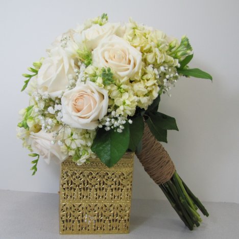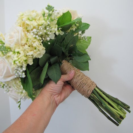 The finished bouquet had beautiful cream roses and dreamy white stock and babies breath with a beautiful finish on the handle.