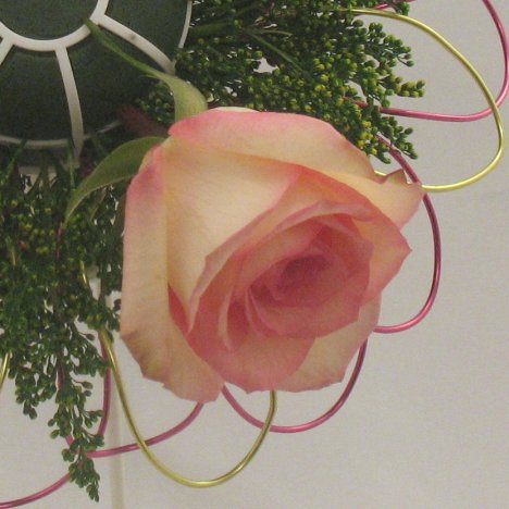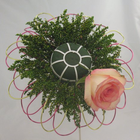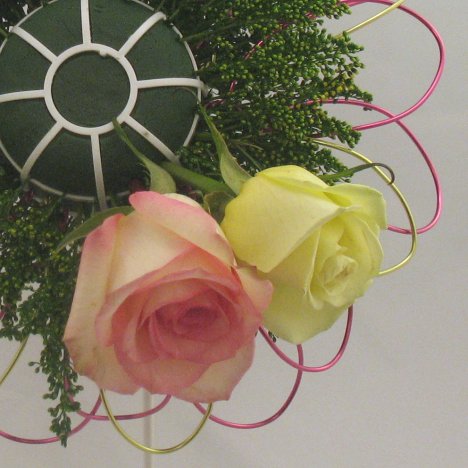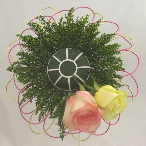 I cluster the rose heads together, inserting the in the foam only about an inch. Take care that the flower heads don't cover up that cool wire collar.