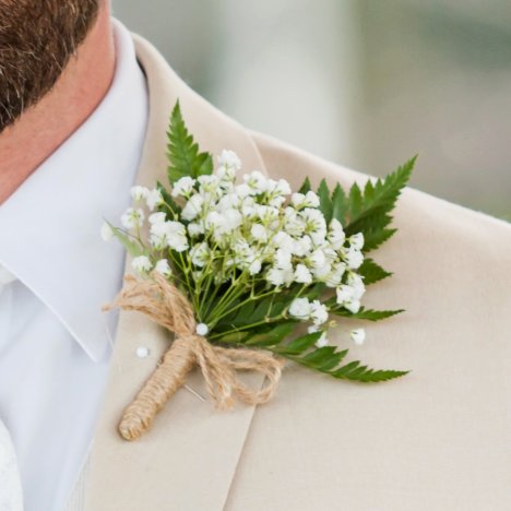 Charming wedding boutonnieres are so simple with a bit of Baby's Breath and a rustic wrap of twine or burlap.