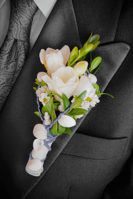 Wedding boutonnieres can be accented with tiny shells for a beach themed ceremony. The nylon cording is wound up the stem and through the flower heads. To create a similar look, you will need the following fresh flowers, greenery and hard goods: