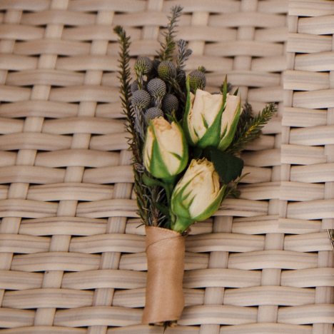 Wedding boutonnieres usually compliment the brides bouquet. You may consider adding an additional flower bud, unique accent or something else special to set the groom's boutonniere apart from all the other boutonnieres.