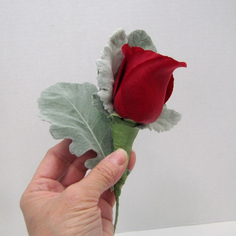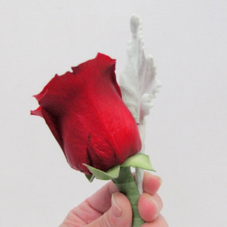 Place the wired leaf behind the rose head, edging it above the top of the wired rose.