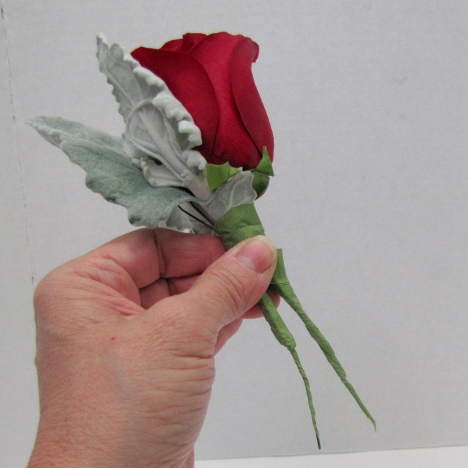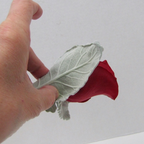 See how the larger leaf wants to bend outward. I want this leaf to gently cup around the red rose.