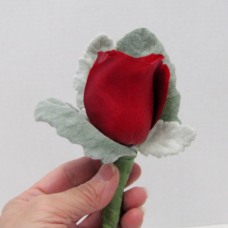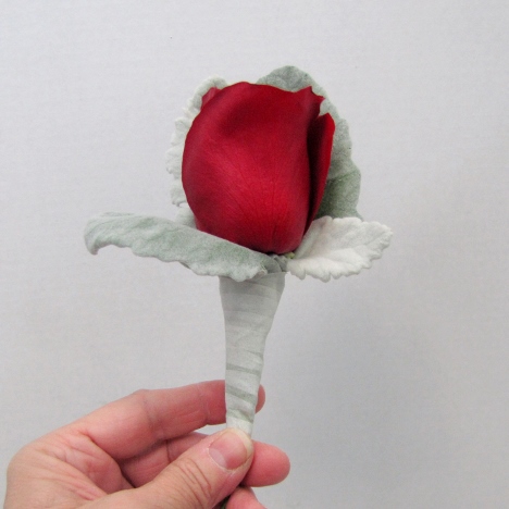 I'm going to actually fold the leaf into place and then tape it to the boutonniere stem. The additional wire support will then be taped into place.