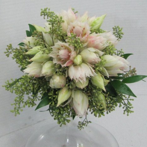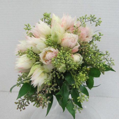 The bright greens of the eucalyptus seeds contrasts nicely with the soft blush pink of the protea.