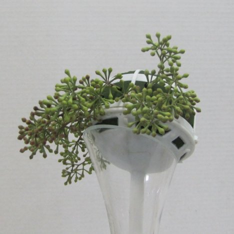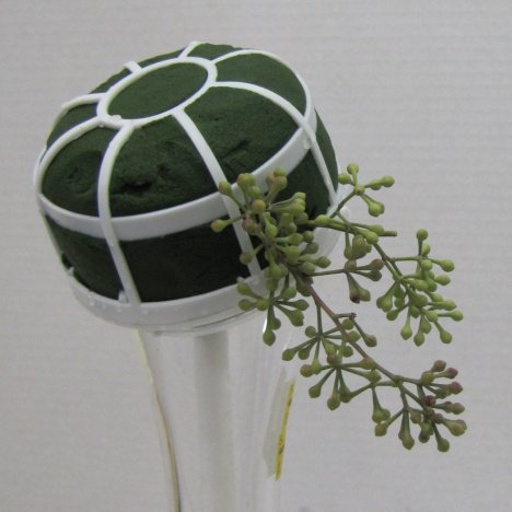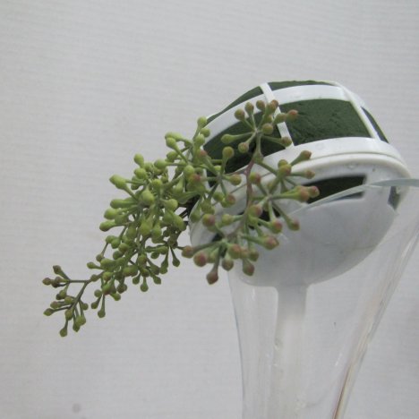 I insert a generous stem of the seeded eucalyptus into the side edge of the holder. Insert the stems deep enough (1" or so) to remain securely seated in the foam - but not so deep that the stems begin the hit into each other in the center of the foam.