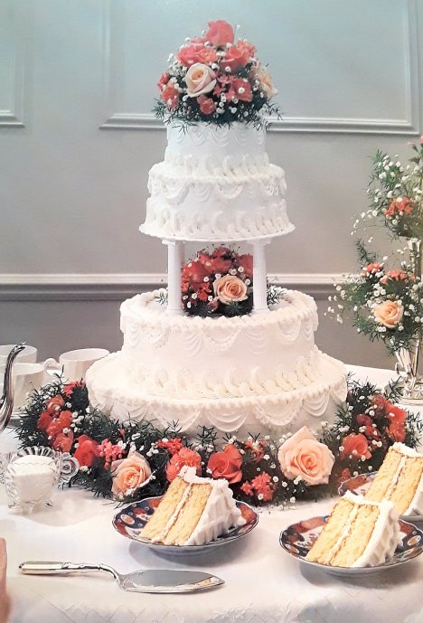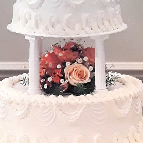 Flower arrangements in the center of the cake are better placed by the baker when she assembles the cake. It is harder to fit within the pillars after the cake is in place than you think. It's best if you have all the arrangements made up and then leave them for her to place on the cake during assembly.