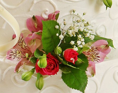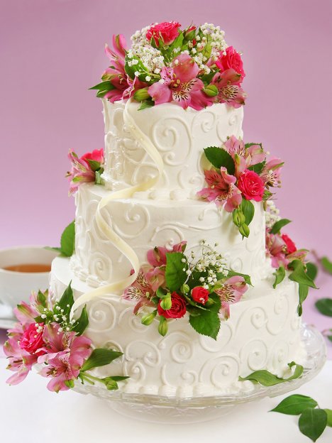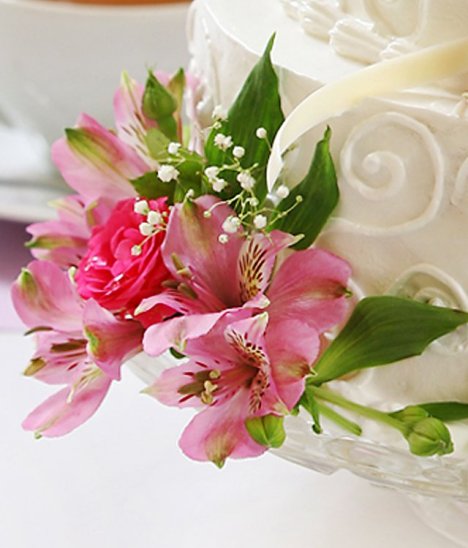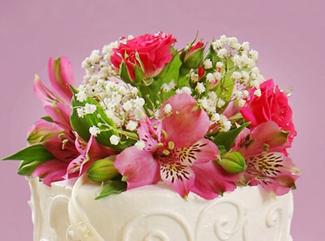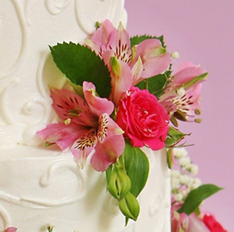 This wedding cake with pink flowers can be decorated very quickly on the wedding day, especially if you take the time to prepare your flowers in advance. You may use the green leaves on your flower stems, but take the time to attach each to a toothpick so you may insert them into the cake exactly where needed on your design.