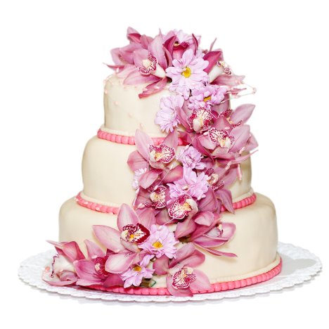 This lovely pink wedding cake is adorned with Cymbidium orchids. Tropical orchids hold up extremely well and are available in other colors.