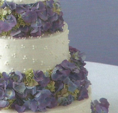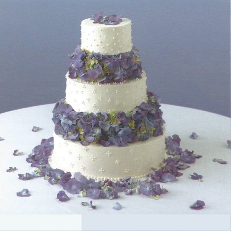 Wedding cakes decorated with fresh flowers usually reflect the colors and flowers carried by the wedding bride. This sweet design is made up entirely of blue hydrangeas.