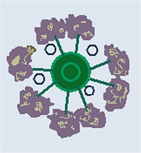 Looking down on the cake (before the second and third layer of the cake is in place, you can see the Iglu goes in the center, and the stems of each hydrangea insert into it from the sides. The black circles are the pillars between the cakes.