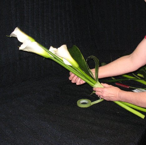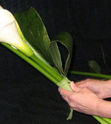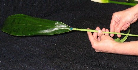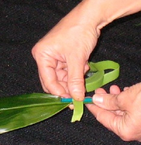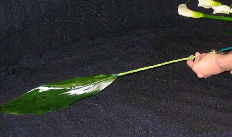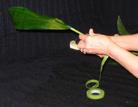 I want the next leaf to be placed higher than the stem allows. I lengthen the Ti leaf by taping it to a wooden Cowee stick.