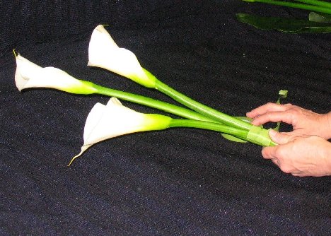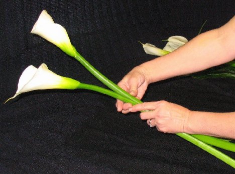 Take up two callas and press their stems together. One flower head needs to be higher than the other, as you will stagger the heads as you tape the flowers together.