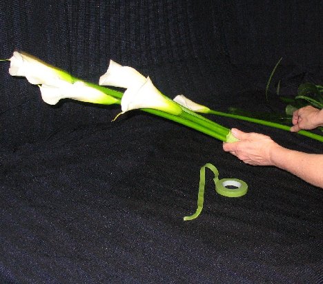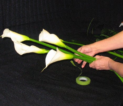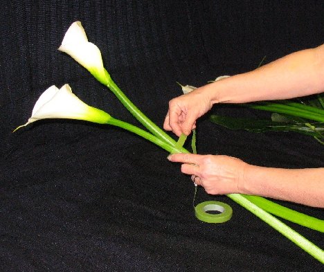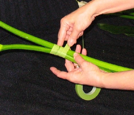 Using stretch corsage tape, tape the stems together, pulling the tape as you wind it around the stems. The tape becomes sticky, and will adhere to itself.