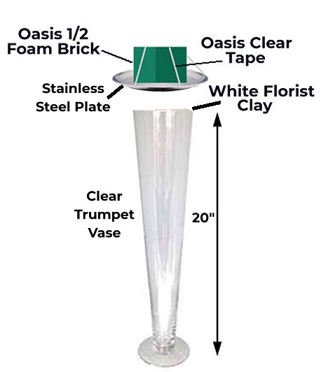 Let's start with the basic mechanics of assembling the components of this vase design. You must keep delivery in mind. Completely assembled arrangements that are tall are hard to deliver. It is easier if you design the flowers on a separate plate that has the foam secured to it with waterproof or clear florist tape. The white clay is used on the rim of the vase once it has been delivered to the venue. You then lift the finished design and place it on top of the vase. Push down firmly and the stainless plate will adhere tightly to the top of the vase. If you wish to fill the inside of the vase with a flower, water beads, marbles or table scatter, you need to do this before placing the arrangement on the vase. Clay holds tightly, even if splashed with water.