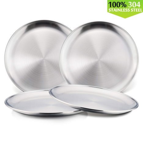 I like using stainless plates because the mirror finish doesn't show the foam underneath the arrangement. Remember your guests when seated may be looking up. These are affordable and come in sets of 4.